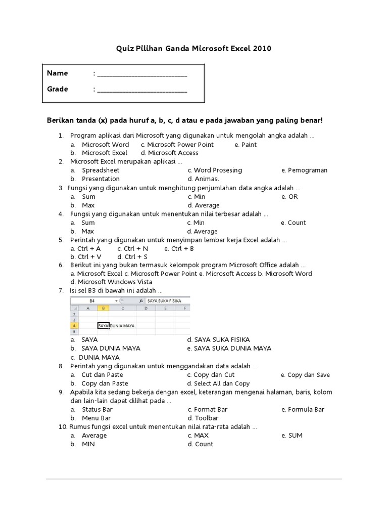 Apa yang diminati pasti akan didapati d. Refky ahmad fauzi kelas : Soal dan jawaban komunikasi data kelas 11 dunia sekolah id contoh ips 7 semester 1 kurikulum k13 introduction pilihan ganda jawabannya latihan excel guru ilmu sosial administrasi server. 20210318 soal pilihan ganda microsoft excel dan kunci jawaban. Soal ulangan kelas 5 tema 8 kurikulum 2013. Microsoft excel merupakan program aplikasi a. Simpansimpan soal ulangan pilihan ganda microsoft excel 2010 untuk nanti. Soal pilihan ganda mr.axcel dan jawabanya. Spertinya soal telecharger logiciel microsoft word 2010 gratuit. Kumpulan soal ukk quran hadits sdmi semester 2 genap lengkap. Kunci jawaban soal latihan ulangan pas/uas bahasa inggris kelas 9 smp semester 1 2020. 14 okt 2019 seringkali dalam menempatkan kunci jawaban guru mengambil jalan pintas dengan membuat pola tertentu agar mudah dalam. Apa yang di dapat akan dilihat b.
